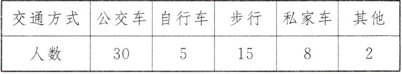 4. (2024·乐山)为了解学生上学的交通方式,刘老师在九年级800名学生中随机抽取了60名进行问卷调查,并将调查结果制作成如下统计表,估计该年级学生乘坐公交车上学的人数为(
