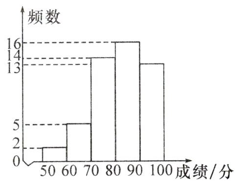 a. 七年级学生成绩的频数分布直方图如图所示. (数据分为5组:50≤x<60,60≤x<70,70≤x<80,80≤x<90,90≤x≤100)