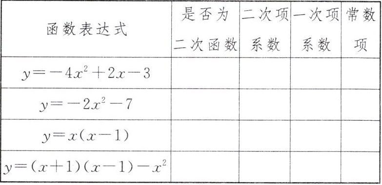 4. 判断下列函数是否为二次函数,若是二次函数,分别写出它们的二次项系数、一次项系数和常数项。