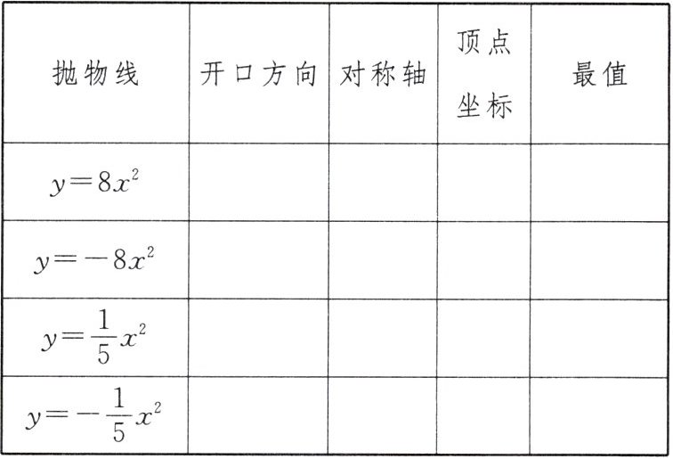 4. 填写下列抛物线的开口方向、对称轴、顶点坐标以及最值。