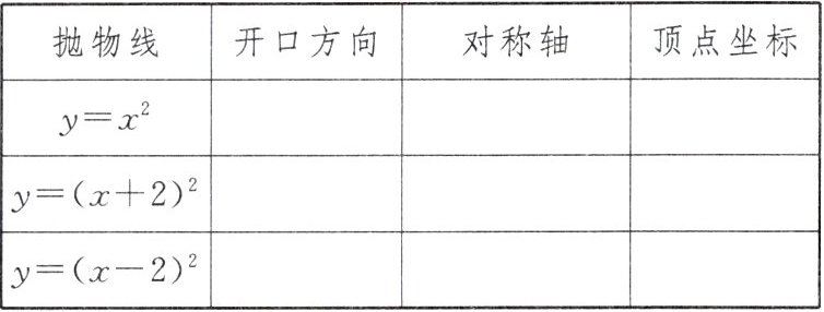 4. (1)在如图所示的平面直角坐标系中画出函数 $ y = x^2 $,$ y = (x + 2)^2 $,$ y = (x - 2)^2 $ 的图象。