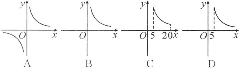 7. 某学校要种植一块面积为100m²的矩形草坪,要求两边长均不小于5m,则草坪的一边长y(m)随另一边长x(m)的变化而变化的图象可能是(