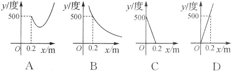 2. “科学用眼,保护视力”是青少年珍爱生命的具体表现.科学证实:近视眼镜的度数y(度)与镜片焦距x(m)成反比例.若500度近视眼镜片的焦距为0.2m,则表示y与x函数关系的图象大致是(