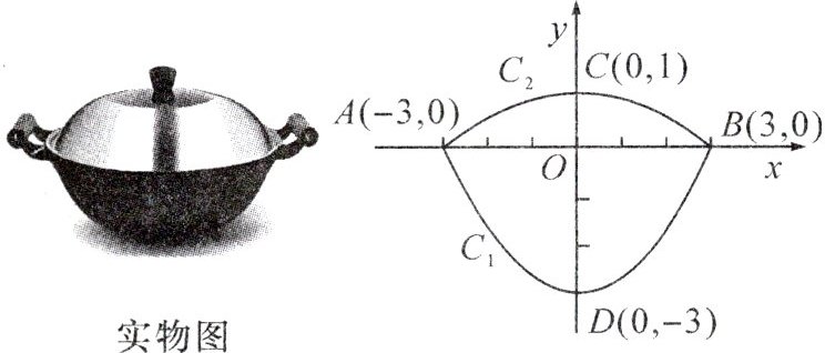 13. 新考向 真实情境 我们常见的炒菜锅和锅盖都是抛物线面,经过锅心和盖心的纵断面是两段抛物线组合而成的封闭图形,不妨简称为“锅线”。锅口直径为 $ 6 dm $,锅深 $ 3 dm $,锅盖高 $ 1 dm $(锅口直径与锅盖直径视为相等),建立平面直角坐标系如图所示,把锅纵断面的抛物线记为 $ C_{1} $,锅盖纵断面的抛物线记为 $ C_{2} $。