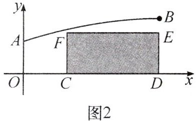 10. (2024·南宁四十七中月考) 图 1 为一汽车停车棚,其棚顶的横截面可以看作是抛物线的一部分,图 2 是棚顶的竖直高度 $ y(m) $ 与距离停车棚支柱 $ AO $ 的水平距离 $ x(m) $ 近似满足的函数关系式 $ y = -0.02x^{2} + 0.3x + 1.6 $ 的图象,点 $ B(6,2.68) $ 在图象上. 若一辆厢式货车需在停车棚下避雨,货车截面看作长 $ CD = 4\ m $,高 $ DE = 1.8\ m $ 的矩形,则货车