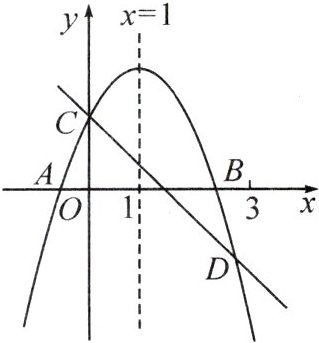 9. 如图所示,已知二次函数 $ y = ax^{2} + bx + c $ 的图象与 $ x $ 轴交于 $ A $,$ B $ 两点,与 $ y $ 轴交于点 $ C $,对称轴为直线 $ x = 1 $,直线 $ y = -x + c $ 与抛物线 $ y = ax^{2} + bx + c $ 交于 $ C $,$ D $ 两点,点 $ D $ 在 $ x $ 轴下方且横坐标小于 3,则下列结论:① $ 2a + b + c > 0 $;② $ a - b + c < 0 $;③ $ x(ax + b) \leq a + b $;④ $ a < -1 $. 其中正确的是