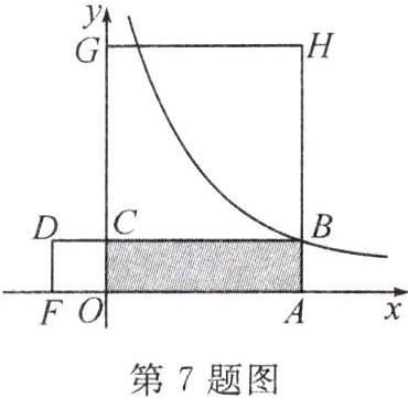 7. (2024·贵港桂平市期中)如图, $ B $ 是反比例函数 $ y = \frac{k}{x} $ 在第一象限的图象上的一点,矩形 $ OABC $ 的周长是 20,正方形 $ OCDF $ 与正方形 $ BCGH $ 的面积之和为 68,则 $ k $ 的值为