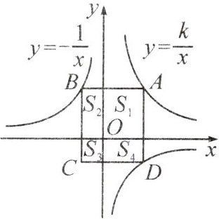5. (2023·广西)如图,过 $ y = \frac{k}{x}(x > 0) $ 的图象上的点 $ A $,分别作 $ x $ 轴、 $ y $ 轴的平行线交 $ y = -\frac{1}{x} $ 的图象于 $ B,D $ 两点,以 $ AB,AD $ 为邻边的矩形 $ ABCD $ 被坐标轴分割成四个小矩形,面积分别记为 $ S_1,S_2,S_3,S_4 $.若 $ S_2 + S_3 + S_4 = \frac{5}{2} $,则 $ k $ 的值为