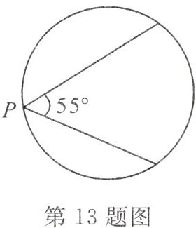 13. 新考向 真实情境(2023·郴州)如图,某博览会上有一个圆形展示区,在其圆形边缘的点$P$处安装了一台监视器,它的监控角度是$55^{\circ}$,为了监控整个展区,最少需要在圆形边缘上共安装这样的监视器