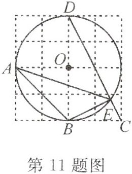 11. 如图,在$4×4$的正方形网格图中,已知点$A$,$B$,$C$,$D$,$O$均在格点上,其中点$A$,$B$,$D$又在$\odot O$上,$E$是线段$CD$与$\odot O$的交点,则$\angle BAE$的正切值为