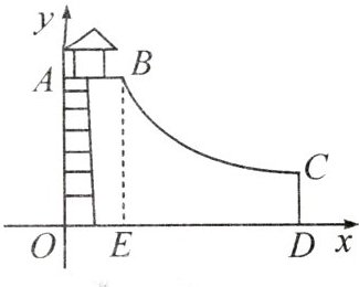 13. (2023·贵港港北区模拟)如图,这是某公园“水上滑梯”的侧面图,其中 $ BC $ 段可看成是一段双曲线,建立如图所示的平面直角坐标系.已知矩形 $ AOEB $ 为向上攀爬的梯子, $ OA = 5 $ 米,进口 $ AB // OD $,且 $ AB = 2 $ 米,出口 $ C $ 点距水面的距离 $ CD $ 为 1 米,则 $ B,C $ 之间的水平距离 $ DE $ 的长度为 (