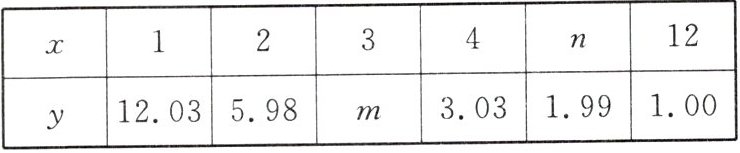 (1) 由表中自变量 $ x $ 和因变量 $ y $ 的数值可知:自变量 $ x $ 和因变量 $ y $ 的乘积都约等于 12,且随着自变量 $ x $ 值的逐渐增大,因变量 $ y $ 的值逐渐减小,故两个变量 $ x $ 和 $ y $ 之间可能是反比例函数关系.