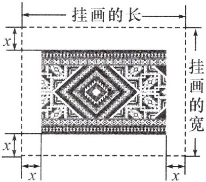 6. 新考向 地域文化(2024·南宁期末)广西壮锦被誉为指尖上的非遗,经纬交织之处,绘就民族华章. 现需将一幅长为 $ 6 \, m $,宽为 $ 4 \, m $ 的壮锦四周镶上宽度相等的锦缎边饰,制成一幅矩形挂画,如图所示. 设边饰的宽度为 $ x \, m $.