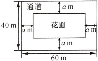 10. 如图,为美化校园环境,某校计划在一块长为 $ 60 \, m $,宽为 $ 40 \, m $ 的矩形空地上修建一个矩形花圃,并将花圃四周余下的空地修建成同样宽的通道,设通道的宽为 $ a \, m $.