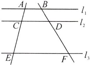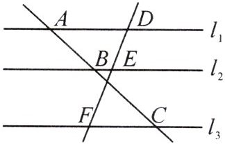 4. 如图,$l_{1}// l_{2}// l_{3}$,$AB=\frac{2}{5}AC$,$DF = 9$,求$EF$的长。