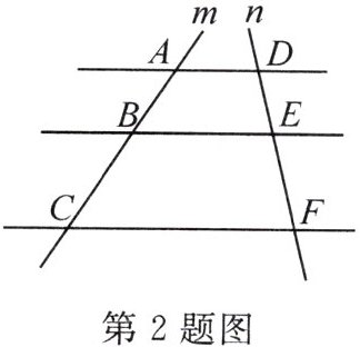 2. (2024·贵港平南县期中)如图,直线$AD// BE// CF$,分别交直线$m$,$n$于点$A$,$B$,$C$和点$D$,$E$,$F$。若$AB = 3$,$BC = 4$,$EF = 5$,则$DE$的长是(
