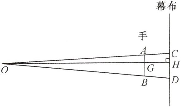 3. 新考向 传统文化 手影戏是一种独特的艺术形式,它通过手势和光影创造出生动的形象.它的原理是利用光的直线传播,将手影投射到幕布上形成各种影像.如图,为了投影出一个动物造型$CD$,手$AB$的长度是$15$cm,$AB // CD$,光源$O$到手$AB$的距离$OG$是$100$cm,手$AB$到幕布的距离$GH$是$20$cm.求此时$CD$的长度.