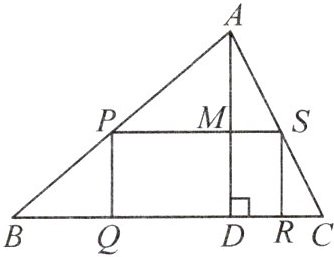 3. 如图,在△ABC中,BC=30,高AD=18,作矩形PQRS,使得点P,S分别落在边AB,AC上,点Q,R落在边BC上,AD交PS于点M。