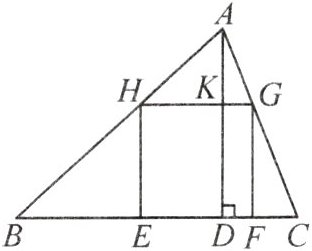 由正方形的性质可知,HG//BC,得到△AHG∽△ABC,根据相似三角形的性质,得$\frac{AK}{AD}=\frac{HG}{BC}$。设正方形的边长为x cm,则AK=(20−x)cm,HG=x cm,代入求出x的值即可。