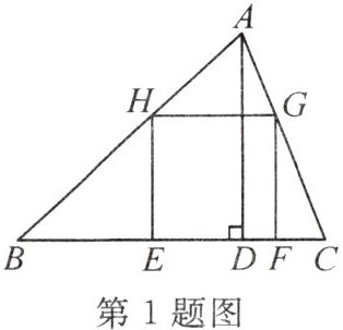 1. 如图,△ABC为锐角三角形,AD是边BC上的高,正方形EFGH的一边EF在BC上,顶点G,H分别在AC,AB上。若BC=60 cm,AD=40 cm,则这个正方形的面积是