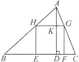 如图,△ABC为锐角三角形,AD是边BC上的高,正方形EFGH的一边EF在BC上,顶点G,H分别在AC,AB上,BC=30 cm,AD=20 cm。求这个正方形的边长。