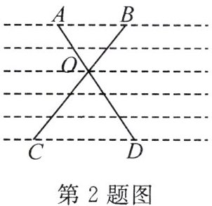2. 新考向 真实情境 如图,顽皮的小聪在小芳的作业本上画了一个“×”(作业本中的横格线都平行,且相邻两条横格线间的距离都相等),点$A$,$B$,$C$,$D$,$O$都在横格线上,且线段$AD$,$BC$交于点$O$。若线段$AB = 4 cm$,则线段$CD$的长为(