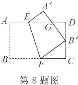 8. 如图,将矩形纸片$ABCD$沿$EF$折叠,点$B$的对应点$B'$恰好落在$DC$的中点上。若$AB = 2$,$BC = 3$,则$△FCB'$与$△B'DG$的面积比为