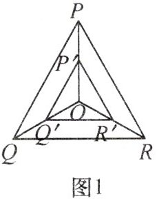 (1)如图 1,点 $ O $ 是等边三角形 $ PQR $ 的中心,$ P' $,$ Q' $,$ R' $ 分别是 $ OP $,$ OQ $,$ OR $ 的中点,则 $ \triangle P'Q'R' $ 与 $ \triangle PQR $ 是位似三角形. 此时,$ \triangle P'Q'R' $ 与 $ \triangle PQR $ 的位似比、位似中心分别为
