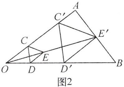(2)证明:$\because E'C'// EC$,$E'D'// ED$,$\therefore \triangle OCE\backsim \triangle OC'E'$,$\triangle ODE\backsim \triangle OD'E'$.$\therefore CE:C'E'=OE:OE'$,$DE:D'E'=OE:OE'$,$\angle CEO=\angle C'E'O$,$\angle DEO=\angle D'E'O$.$\therefore CE:C'E'=DE:D'E'$,$\angle CED=\angle C'E'D'$.$\therefore \triangle CDE\backsim \triangle C'D'E'$.$\because \triangle CDE$是等边三角形,$\therefore \triangle C'D'E'$是等边三角形.