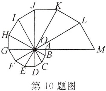 10. 由 $ 12 $ 个有公共顶点 $ O $ 的直角三角形拼成如图所示的图形,$ \angle AOB = \angle BOC = \angle COD = \cdots = \angle LOM = 30^{\circ} $. 若 $ S_{\triangle AOB} = 1 $,则图中与 $ \triangle AOB $ 位似的三角形的面积为(