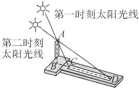 13. 新考向 传统文化(2024·广西模拟)土圭之法是指在平台中央竖立一根八尺长的杆子,观察杆子的日影长度. 古代的人们发现,夏至时日影最短,冬至时日影最长,这样通过日影的长度得到夏至和冬至,确定了四季. 如图,利用土圭之法记录了两个时刻杆的影长,发现第一时刻太阳光线与杆的夹角 $\angle BAC$ 和第二时刻太阳光线与地面的夹角 $\angle ADB$ 相等,测得第一时刻的影长 $BC$ 为 $1.6$ 尺,则第二时刻的影长 $BD$ 为