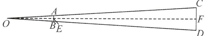 12. 新考向 真实情境(2024·贵港覃塘区期中)如图所示的为步枪在瞄准时的示意图,$AB // CD$,从眼睛 $O$ 到准星的距离 $OE$ 为 $80 cm$,到目标 $F$ 的距离 $OF$ 为 $200 m$,步枪上准星的宽度 $AB$ 为 $2 mm$. 若射击时,由于抖动导致视线偏离了准星上 $E$ 点 $1 mm$,则目标偏离的距离为(