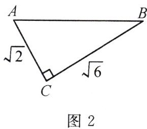 解:图1:$AC=\sqrt{AB^{2}-BC^{2}}=\sqrt{6^{2}-2^{2}}=4\sqrt{2}$,$\therefore \sin A=\frac{BC}{AB}=\frac{1}{3}$,$\sin B=\frac{AC}{AB}=\frac{2\sqrt{2}}{3}$.图2:$AB=\sqrt{AC^{2}+BC^{2}}=\sqrt{(\sqrt{2})^{2}+(\sqrt{6})^{2}}=2\sqrt{2}$,$\therefore \sin A=\frac{BC}{AB}=\frac{\sqrt{6}}{2\sqrt{2}}=\frac{\sqrt{3}}{2}$,$\sin B=\frac{AC}{AB}=\frac{\sqrt{2}}{2\sqrt{2}}=\frac{1}{2}$.