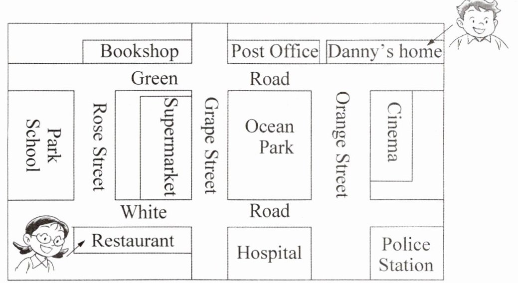 1) She is in the restaurant. 2) She wants to go to the post office. 3) Walk along Grape Street and cross Green Road. She can see the post office on her right. 4) Yes, he does. 5) He wants to see his grandpa. 6) Walk along Green Road and turn left at Grape Street. Cross White Road. They can see the hospital on their left.