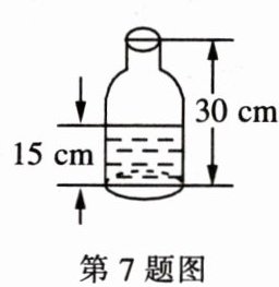 7. 如图,已知这只瓶子的高是30cm,底面内径为8cm,容积为$1256cm^3,$在瓶子中装了一些水,量得水的高度为15cm,如果将瓶口封严后倒置,使瓶口朝下,这时水的高度应是多少?(π取3.14)