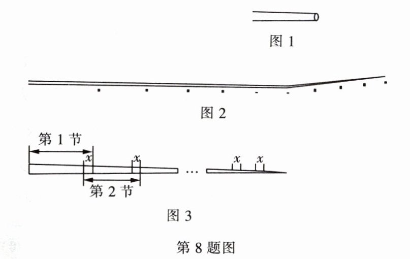 8. 如图是一根可伸缩的鱼竿,鱼竿是用10节大小不同的空心套管连接而成的。闲置时鱼竿可收缩,完全收缩后,鱼竿长度即为第1节套管的长度(如图1所示),使用时,可将鱼竿的每一节套管都完全拉伸(如图2所示)。图3是这根鱼竿所有套管都处于完全拉伸状态下的平面示意图。已知第1节套管长50cm,第2节套管长46cm,依次类推,每一节套管均比前一节套管短4cm。完全拉伸时,为了使相邻两节套管连接并固定,每相邻两节套管间均有相同长度的重叠,设其长度为x cm。