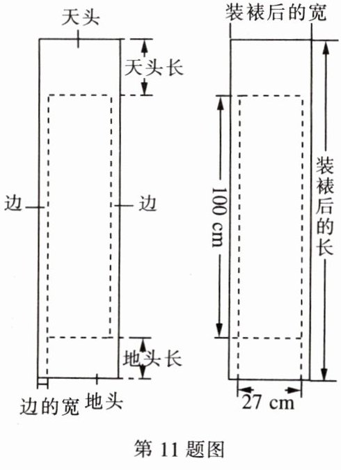 11. (2023·北京)对联是中华传统文化的瑰宝,对联装裱后如图所示,上、下空白处分别称为天头和地头,左、右空白处统称为边。一般情况下,天头长与地头长的比是6:4,左、右边的宽相等,均为天头长与地头长的和的$\frac{1}{10}$。某人要装裱一副对联,对联的长为100cm,宽为27cm。若要求装裱后的长是装裱后的宽的4倍,求边的宽和天头长。