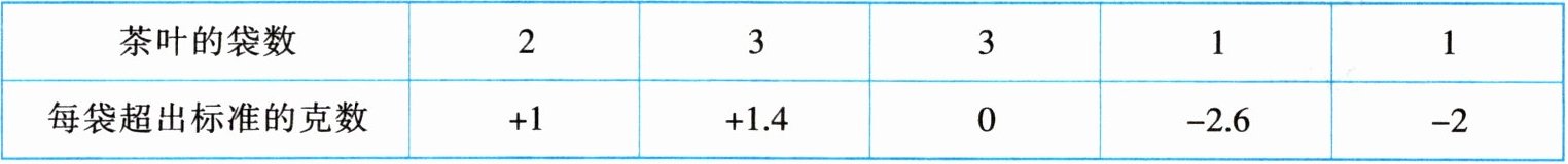 (1)$\because |+1|<2.5$,$|+1.4|<2.5$,$|0|<2.5$,$|-2.6|>2.5$,$|-2|<2.5$,$\therefore$ 合格茶叶的袋数为$2+3+3+1=9$(袋),$9÷10×100\%=90\%$。$\therefore$ 茶叶的合格率为$90\%$。(2)$2×1+3×1.4+3×0+1×(-2.6)+1×(-2)=2+4.2+0-2.6-2=6.2-4.6=1.6$(g),$\therefore 500×10+1.6=5001.6$(g)。答:这10袋茶叶的总质量为5001.6g。