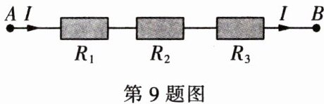 9. (2024·广州) 如图,把 $ R_{1} $,$ R_{2} $,$ R_{3} $ 三个电阻串联起来,线路 $ AB $ 上的电流为 $ I $,电压为 $ U $,则 $ U = IR_{1}+IR_{2}+IR_{3} $,当 $ R_{1}= 20.3\Omega $,$ R_{2}= 31.9\Omega $,$ R_{3}= 47.8\Omega $,$ I = 2.2 A $ 时,$ U $ 的值为____。