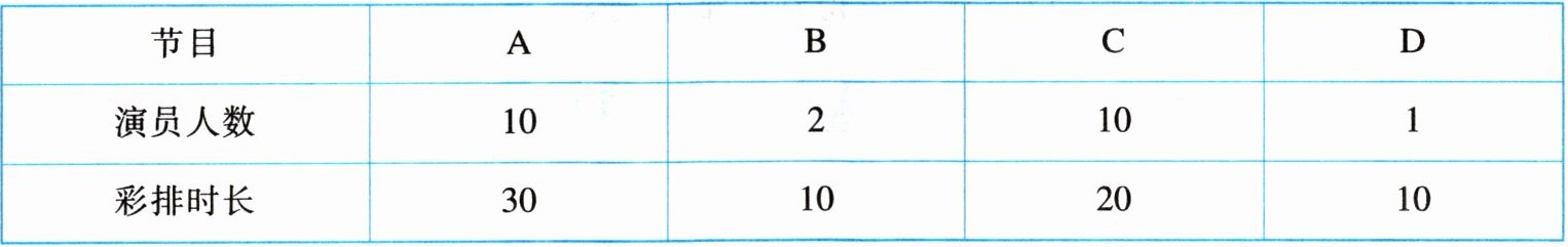 11. (2024·北京) 联欢会有 $ A $,$ B $,$ C $,$ D $ 四个节目需要彩排,所有演员到场后节目彩排开始。一个节目彩排完毕,下一个节目彩排立即开始。每个节目的演员人数和彩排时长(单位:$ min $)如下: