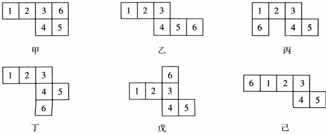 解:乙、戊两同学是正确的,甲同学的图形不能折叠,丙同学6和4重合,丁同学6和1重合,己同学6和5重合。