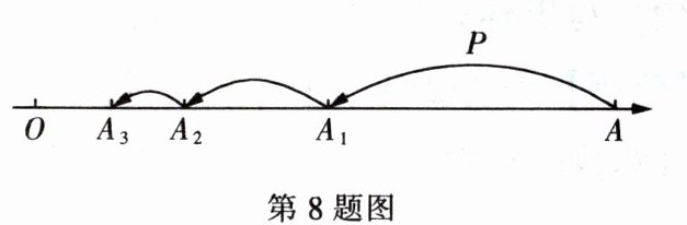 8. 如图,数轴上 O,A 两点的距离为 3,一动点 P 从点 A 出发,按以下规律跳动:第 1 次跳动到 AO 的中点$$A_{1}$$处,第 2 次从$$A_{1}$点跳动到$A_{1}O$的中点$A_{2}$$处,第 3 次从$$A_{2}$点跳动到$A_{2}O$的中点$A_{3}$$处,按照这样的规律继续跳动到点$$A_{4}$$,$$A_{5}$$,$$A_{6}$$,…,$$A_{n}$$(n≥3,n 是整数)处,那么线段$$OA_{n}$$的长度为( )