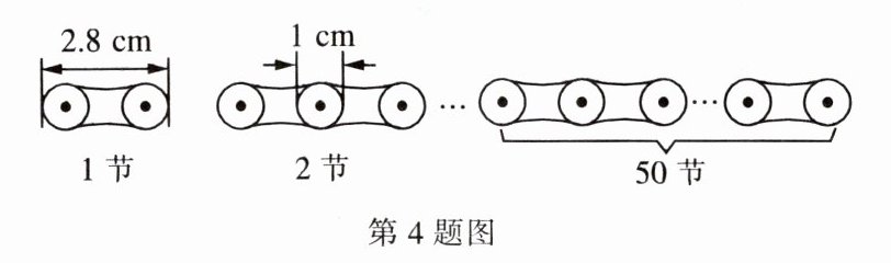 4. 如图,某链条每节长为2.8 cm,每两节链条相连接部分重叠的圆的直径为1 cm,按这种连接方式,50节链条总长度为______cm。