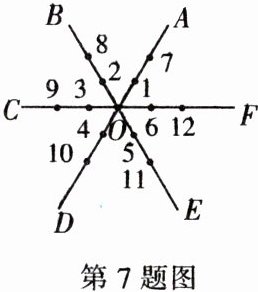 7. 如图,平面内有公共端点的六条射线 $OA$,$OB$,$OC$,$OD$,$OE$,$OF$,从射线 $OA$ 开始按逆时针方向依次在射线上写出数字1,2,3,4,5,6,7,…。