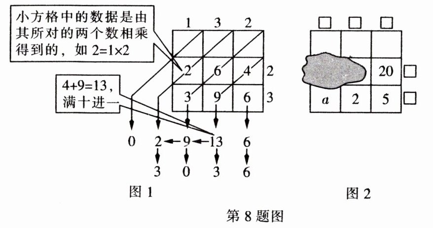 8. (2024·重庆) “铺地锦”是我国古代一种乘法运算方法,可将多位数乘法运算转化为一位数乘法和简单的加法运算。淇淇受其启发,设计了如图1所示的“表格算法”,图1表示 $132× 23$,运算结果为3036。图2表示一个三位数与一个两位数相乘,表格中部分数据被墨迹覆盖,根据图2中现有数据进行推断,正确的是( )
