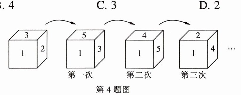 4. 有一个正六面体骰子放在桌面上,将骰子沿如图所示顺时针方向滚动,每滚动90°算一次,则滚动第2024次后,骰子朝下一面的数字是( )