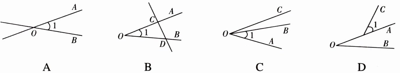 4. 下面四个图形中,能用 $ \angle 1 $,$ \angle AOB $,$ \angle O $ 三种方法表示同一个角的图形是( )