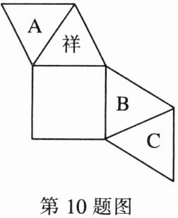 10. (2024·德阳) 走马灯,又称仙音烛,据史料记载,走马灯的历史起源于隋唐时期,盛行于宋代,是中国特色工艺品,常见于除夕、元宵、中秋等节日。在一次综合实践活动中,一同学用如图所示的纸片,沿折痕折合成一个棱锥形的“走马灯”,正方形做底,侧面有一个三角形面上写了“祥”字,当灯旋转时,正好看到“吉祥如意”的字样,则在A,B,C处依次写上的字可以是( )