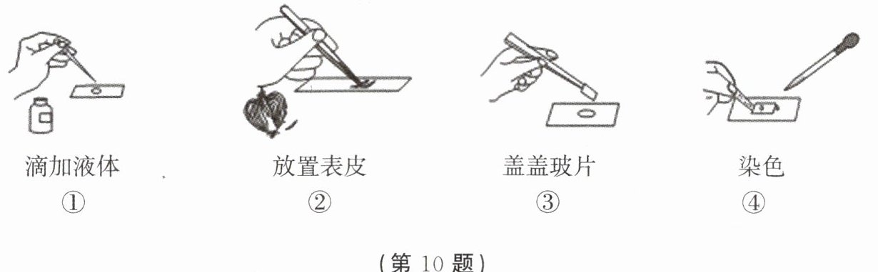 10. 如图表示制作洋葱鳞片叶表皮细胞临时装片的部分操作步骤,其中步骤①和④滴加的液体分别是(