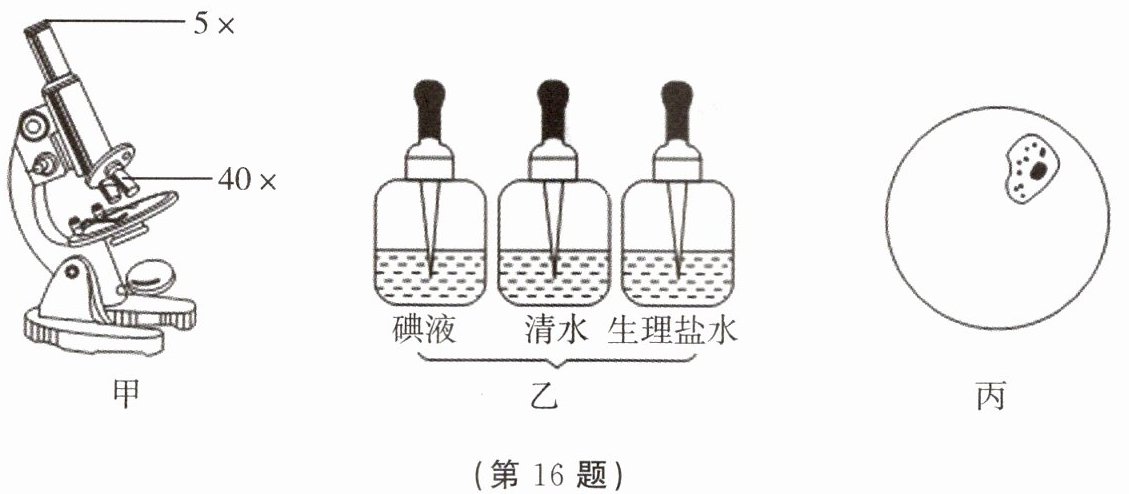 16. 如图是某兴趣小组观察动物细胞时所用的仪器、材料以及观察到的细胞,请据图并运用所学的生物学知识回答下列问题。